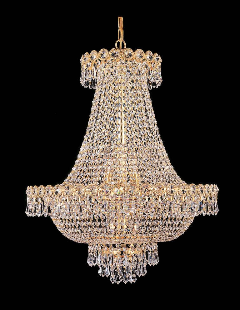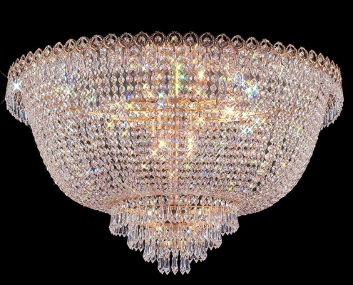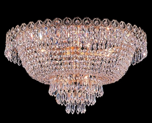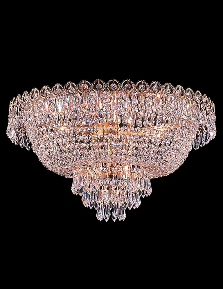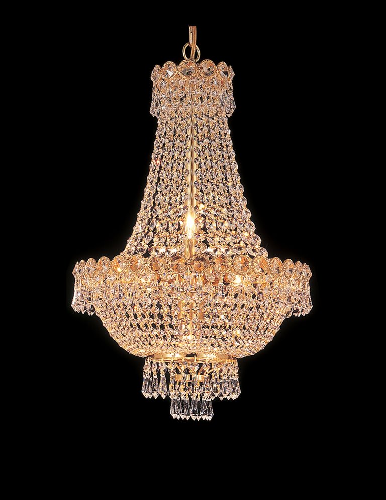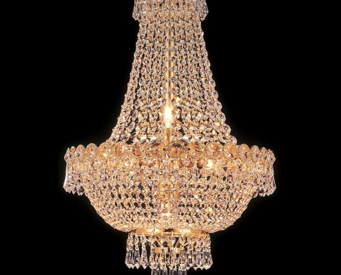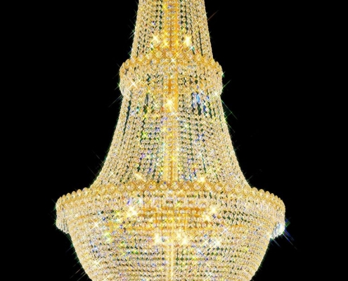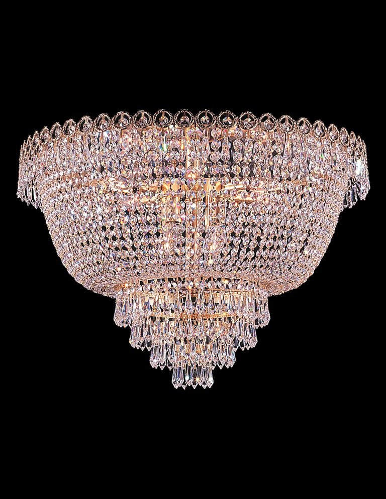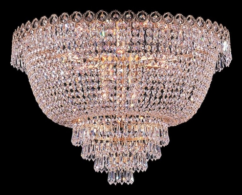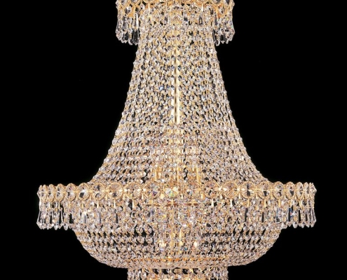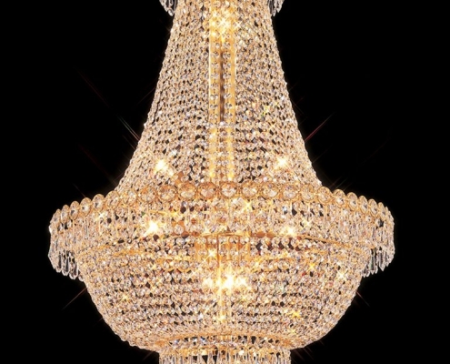 Ashonte’s simple, draping crystal culminates in a natural, full basket that can grace any décor. At any size, the chandelier dominates a room, making its presence felt just as well as any Emperor. The simple coronets of gold-encased crystal circles reinforce this radiating beauty and its style fit for an empire.