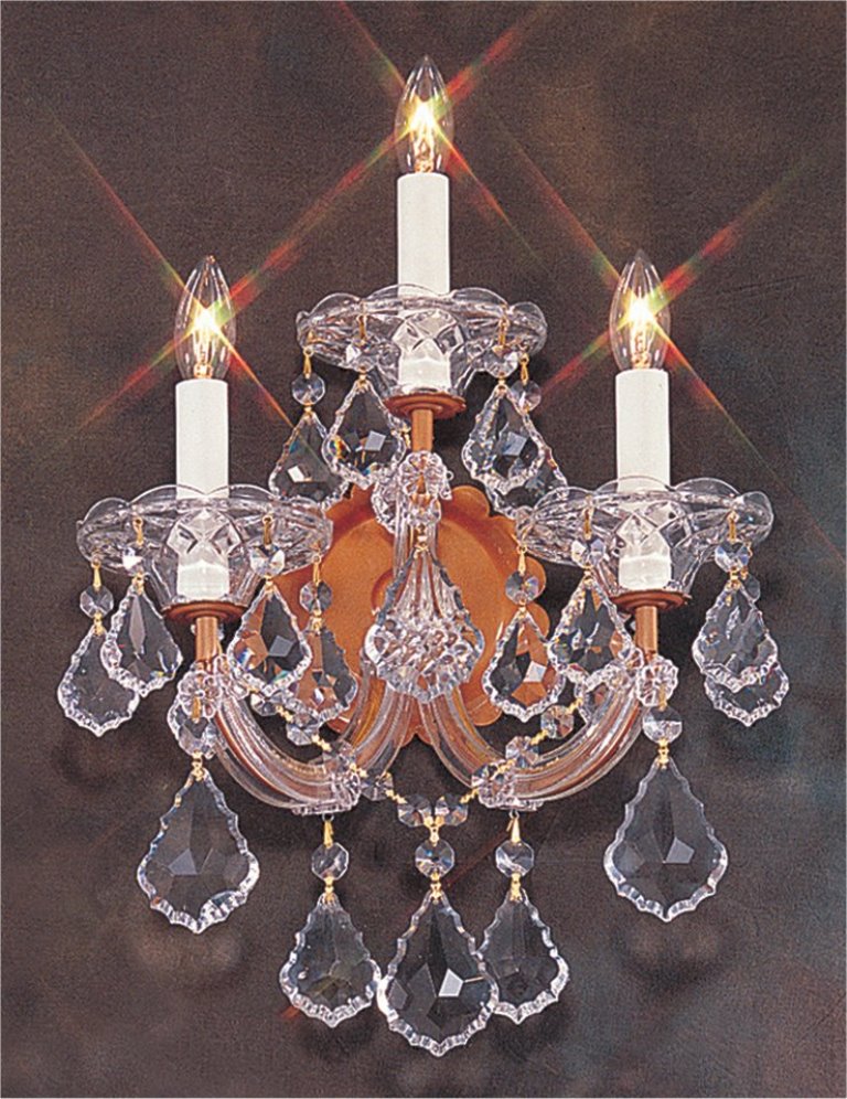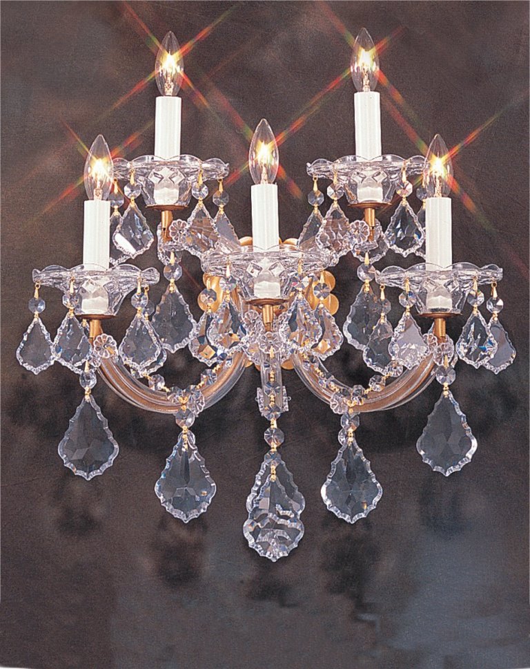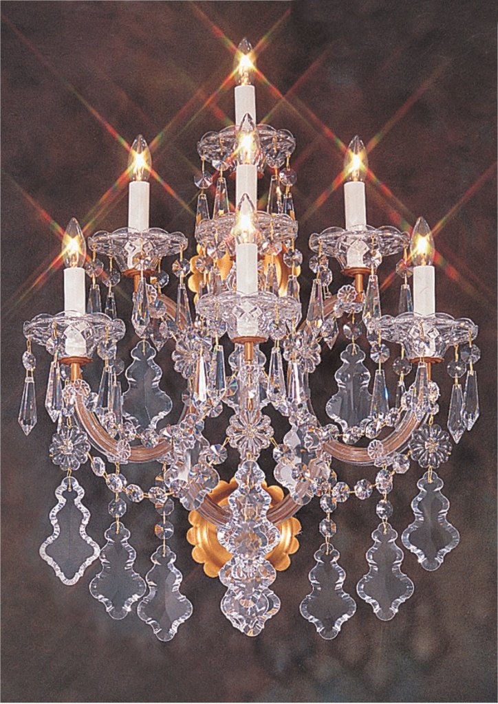 The frame is a combination of hand blown Czech glass panels and rosettes wrapped and bent around a gold-patina steel frame giving the impression of floating glass. Each fixture takes on its own unique design from the arrangement and size of the crystal trim. To this day, the magnificent Schönbrunn houses the charming chandeliers to which Maria Theresa gave her name. They are alive with light “airy and delicate in their finite details.