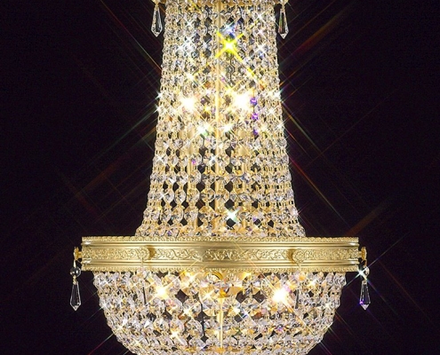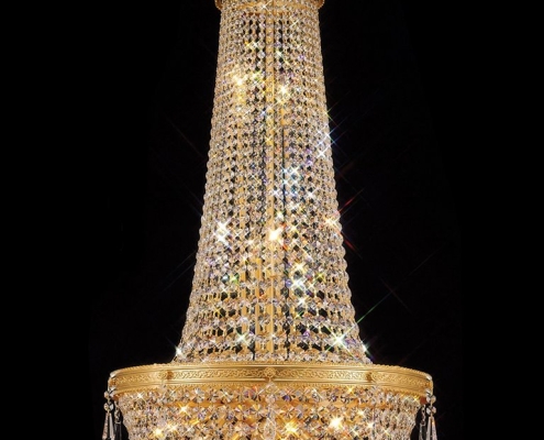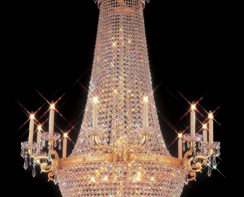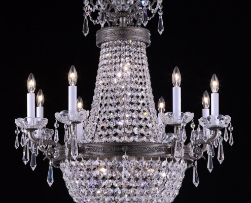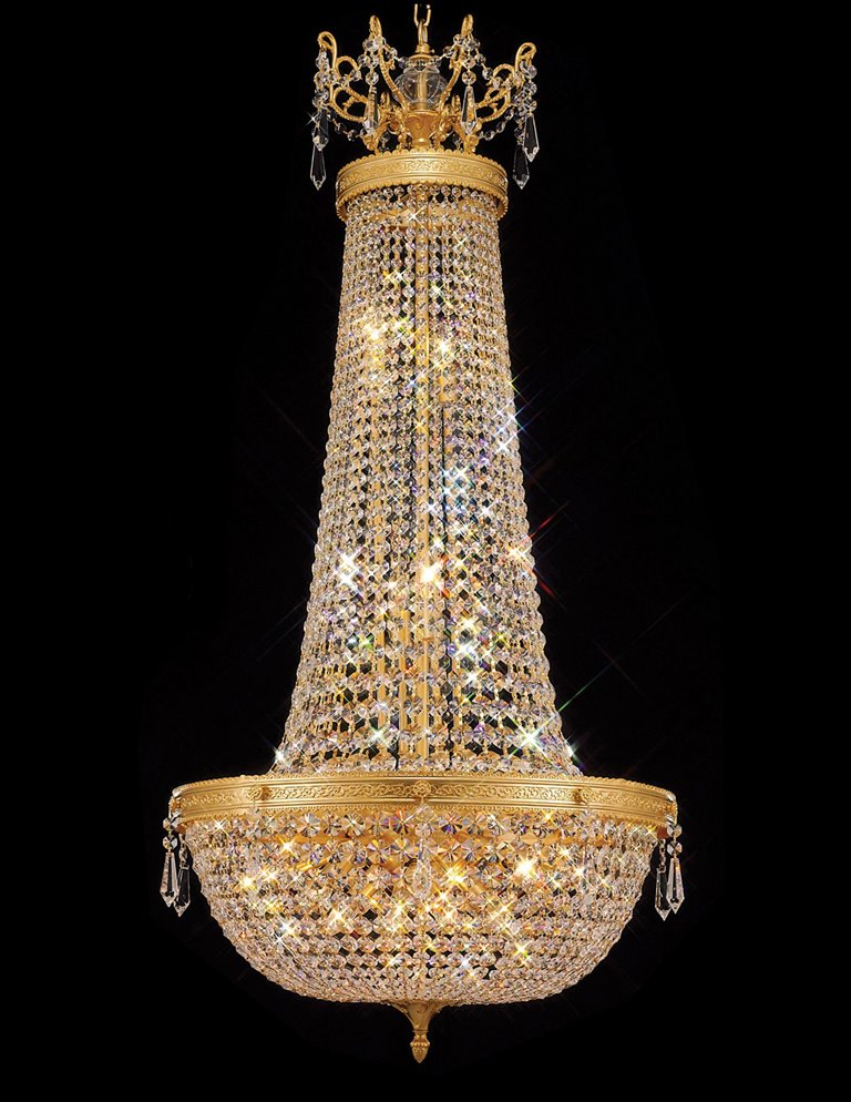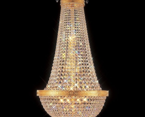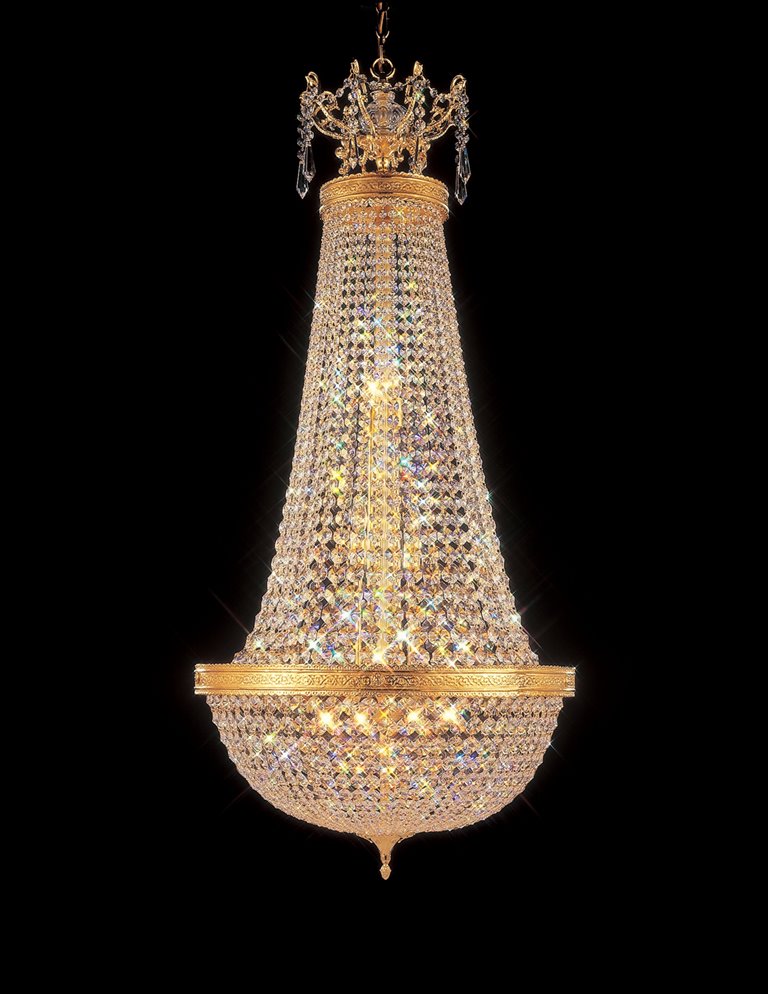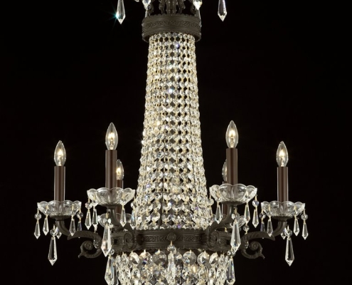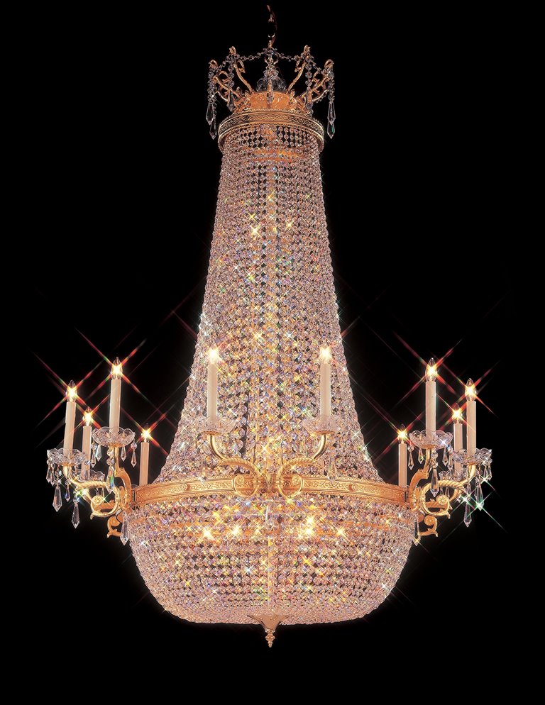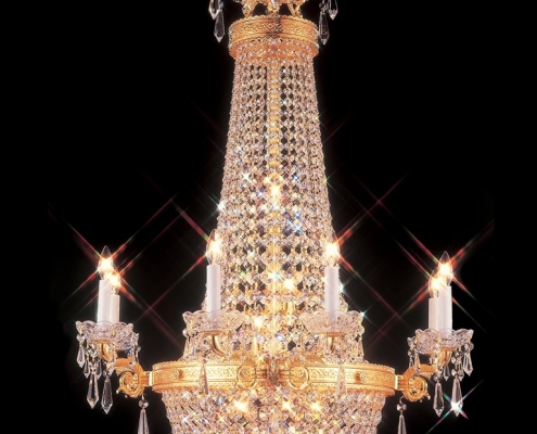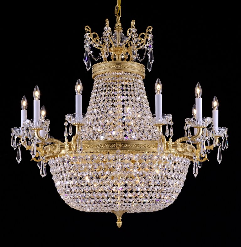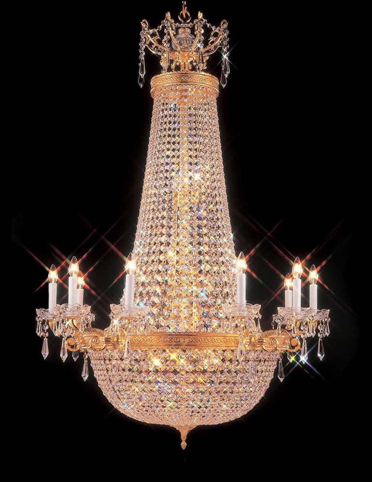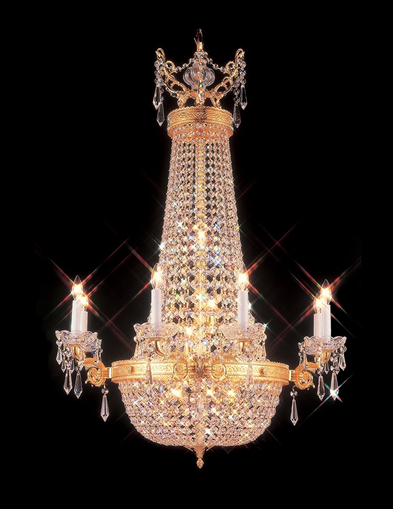Our Queen Anne Chandelier represents all that is desired in crystal styling. Topped by a magnificent golden crown encircling a glass orb, and draped in its own diadems, this elegant chandelier flows gently downward through its crystal chains to a decorative, scrolled band. The final touch comes in the simple crystal pendants that drop from the glass bobeches. The effect is majestic, yet restrained. This is a classic example of hand forging, an age-old process that dates back to the oldest methods of chandelier fabrication. The Queen Anne style of furniture, with its chiseled walnut drawers and cabriole legs, is a perfect complement for this exquisite light. In fact, Pecaso has been approved by the Queen Anne Society as the only lighting manufacturer authorized to create this romantic and elegant design. It is a look that stands the test of time.