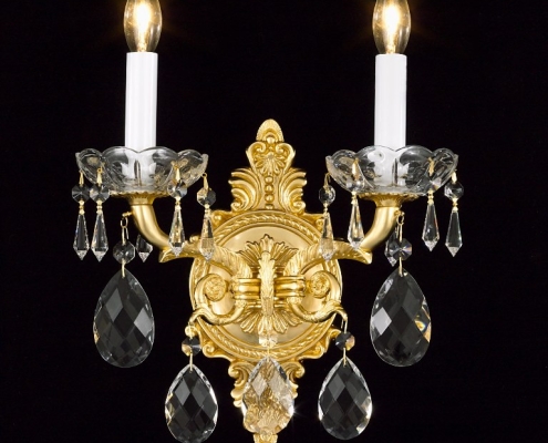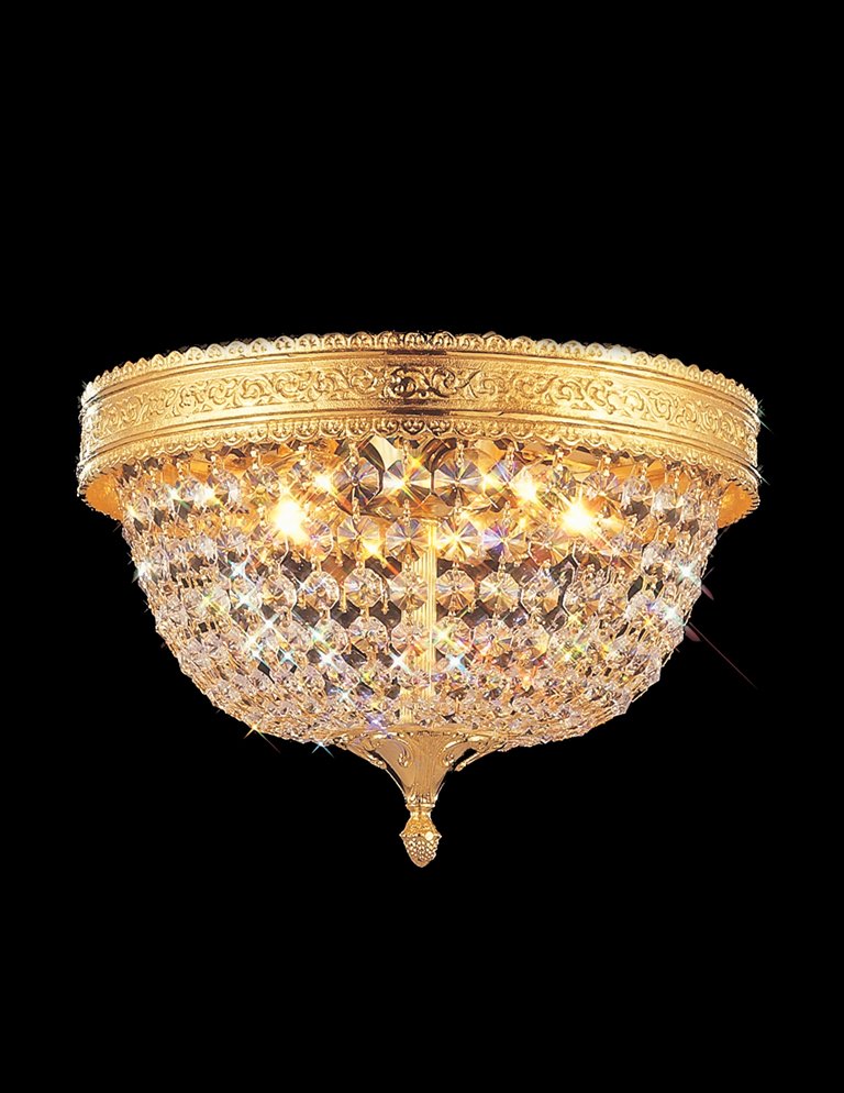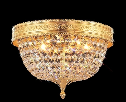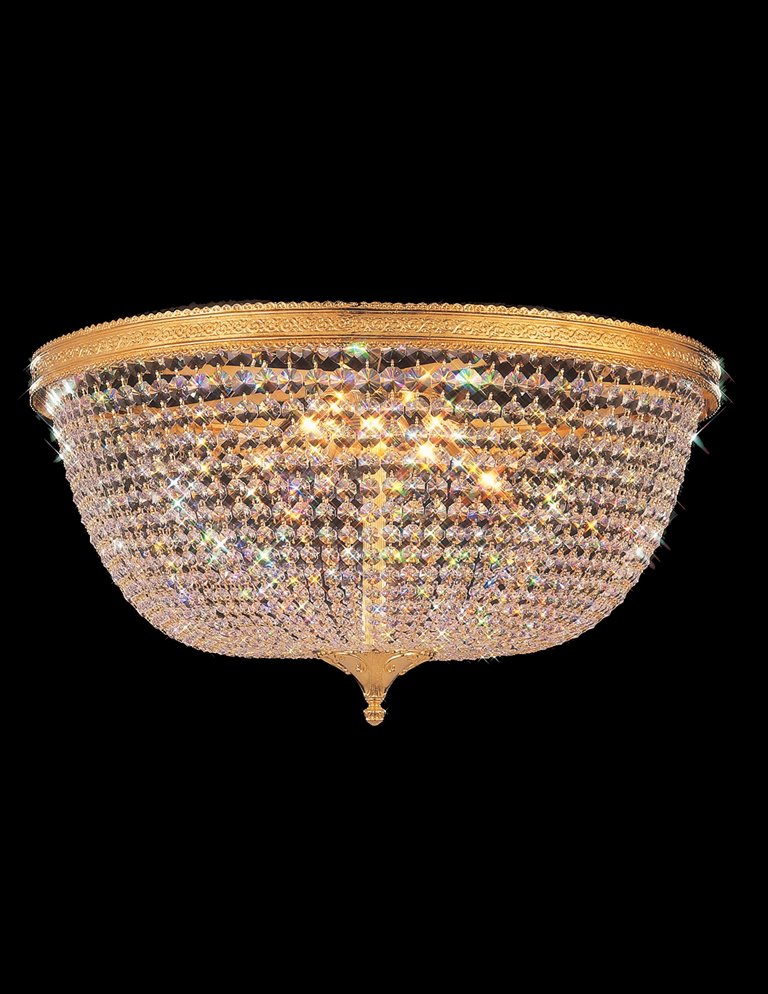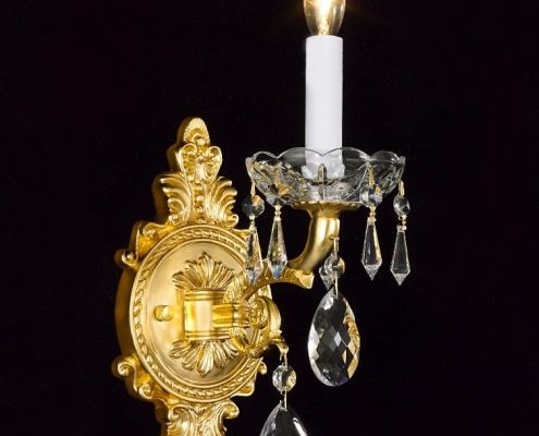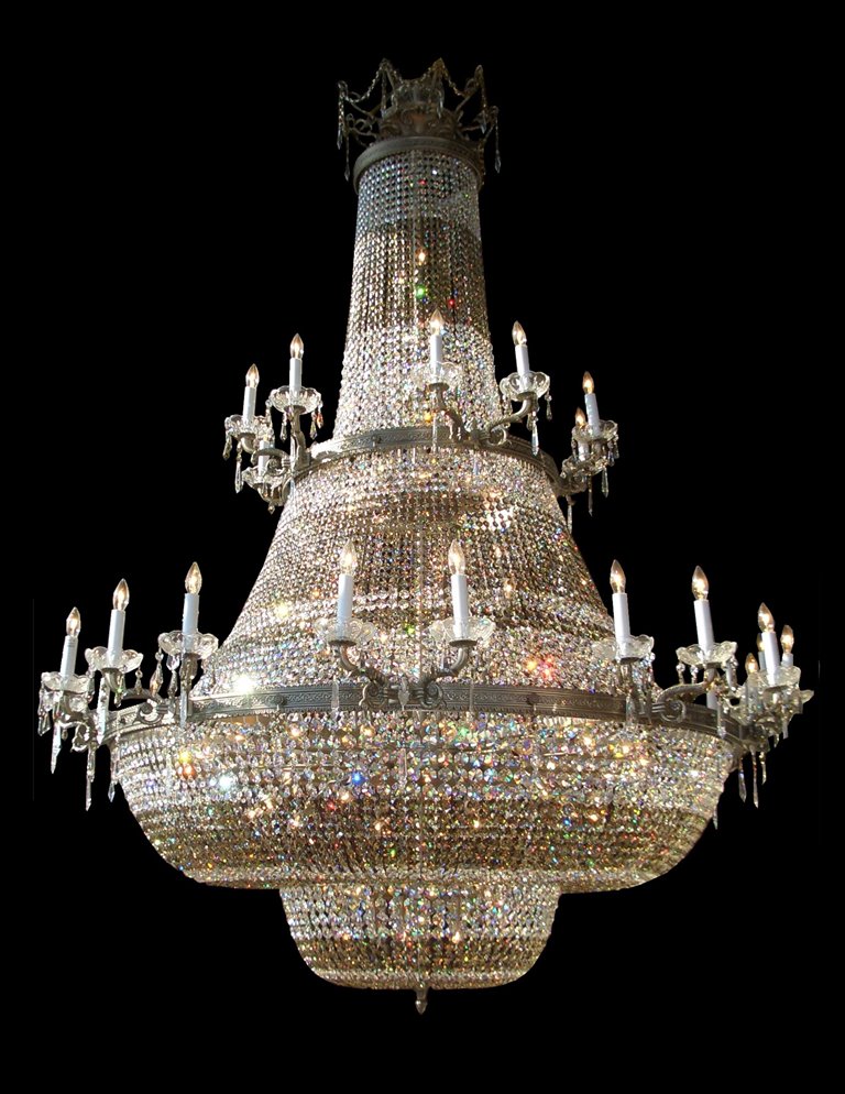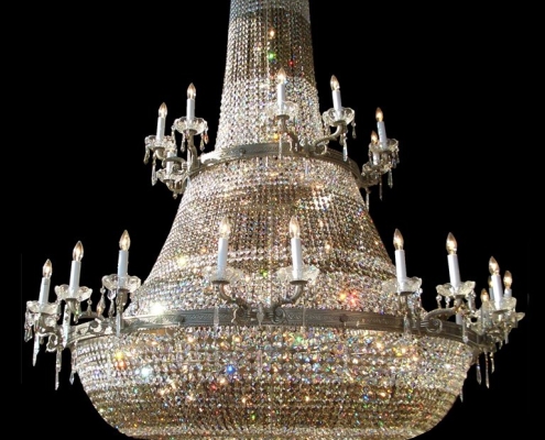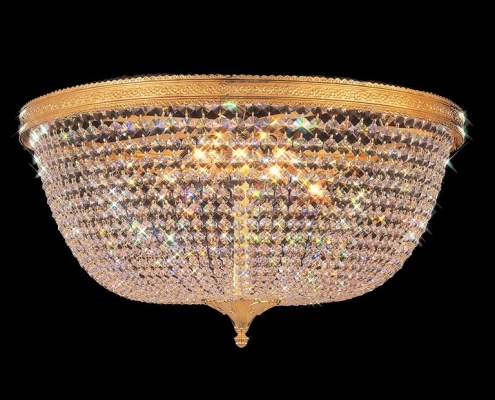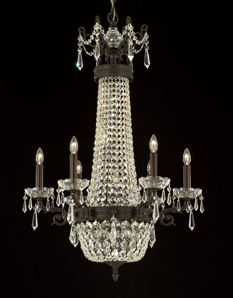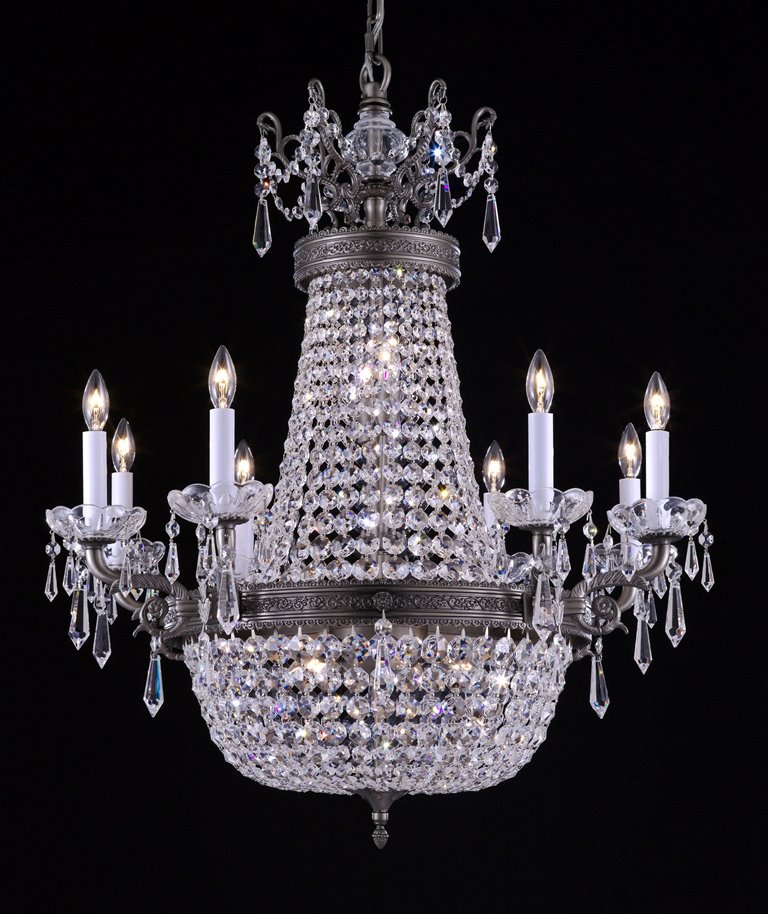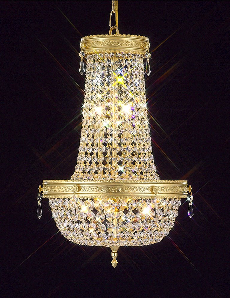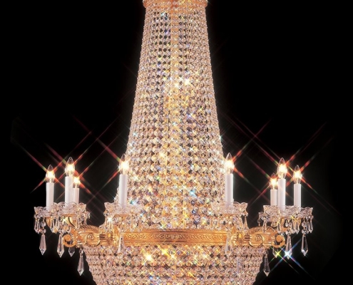 Our Queen Anne Chandelier represents all that is desired in crystal styling. Topped by a magnificent golden crown encircling a glass orb, and draped in its own diadems, this elegant chandelier flows gently downward through its crystal chains to a decorative, scrolled band. The final touch comes in the simple crystal pendants that drop from the glass bobeches. The effect is majestic, yet restrained. This is a classic example of hand forging, an age-old process that dates back to the oldest methods of chandelier fabrication. The Queen Anne style of furniture, with its chiseled walnut drawers and cabriole legs, is a perfect complement for this exquisite light. In fact, Pecaso has been approved by the Queen Anne Society as the only lighting manufacturer authorized to create this romantic and elegant design. It is a look that stands the test of time.